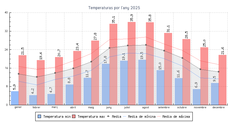 | Mes | Temperatures min | Temperatures max | Mitjana mensual |