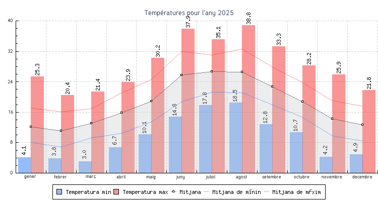 | Mes | Temperatures min | Temperatures max | Mitjana mensual |