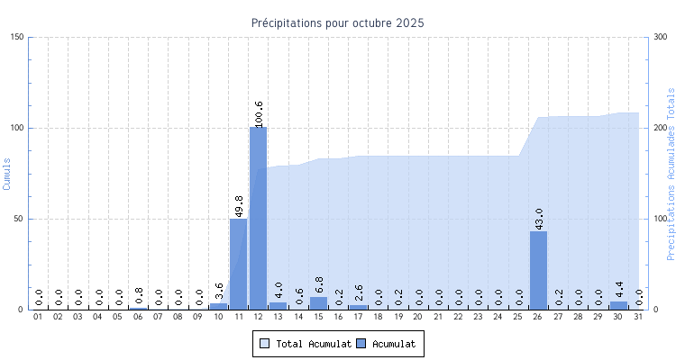 | Total | 10.7 °C | 28.2 °C | 18.9 °C | 3.1 km/h (46.7 km/h) | 216.8 mm | |