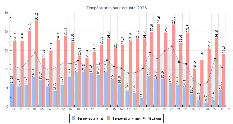 | 01 | 14.9 °C | 23.9 °C | 18.7 °C | 3.6 km/h (19.3 km/h) | N |