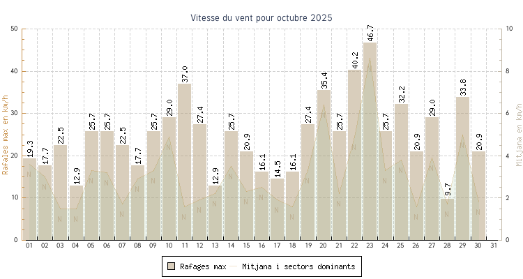 | min | max | mitjana | Velocitat (rafages) | Sector | ||