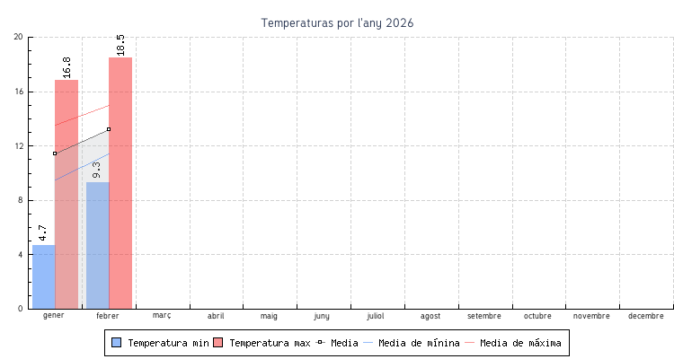 | Mes | Temperatures min | Temperatures max | Mitjana mensual |