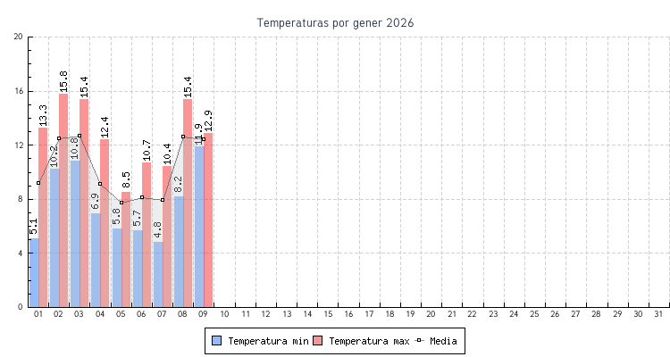 | 01 | 5.1 °C | 13.3 °C | 9.2 °C | 0.4 km/h (9.7 km/h) | ESE |