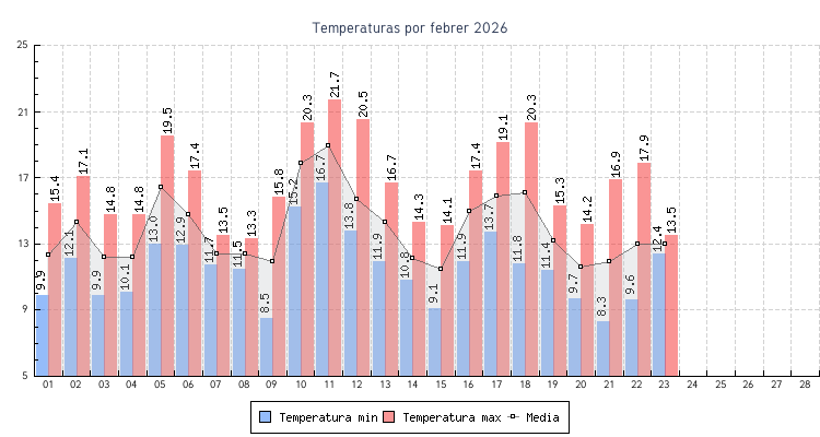 | 01 | 9.9 °C | 15.4 °C | 12.3 °C | 2.0 km/h (17.7 km/h) | E |