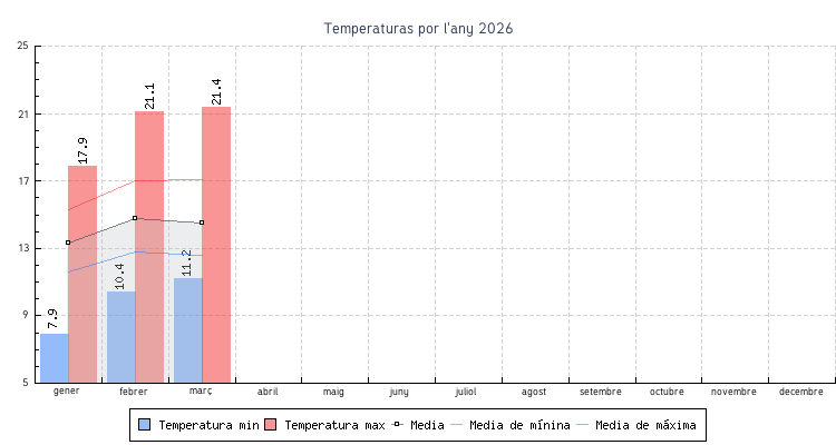 | Mes | Temperatures min | Temperatures max | Mitjana mensual |