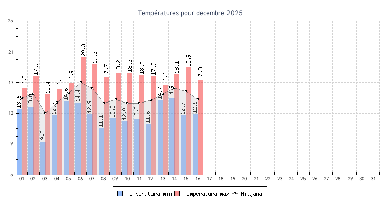 | 09 | 12.3 °C | 18.2 °C | 14.8 °C | 6.2 km/h (25.7 km/h) | SSO |