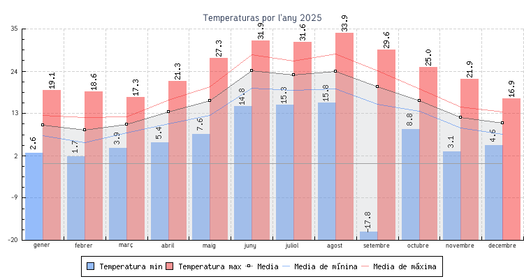 | Mes | Temperatures min | Temperatures max | Mitjana mensual |