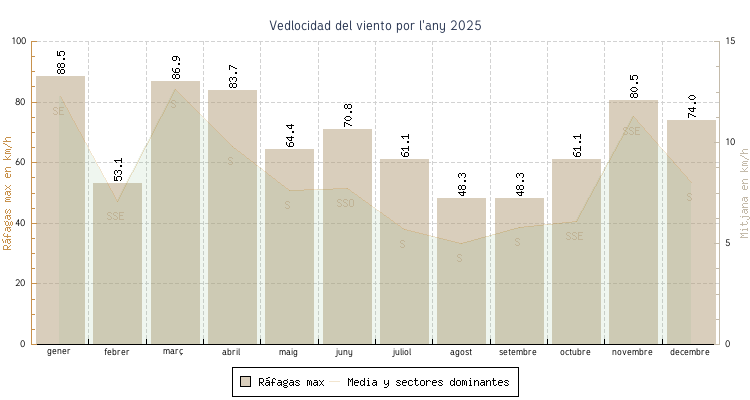 | gener | 2.6 °C | 7.2 °C | 19.1 °C | 12.5 °C | 9.9 °C | 12.3 km/h | 88.5 km/h | SE |
