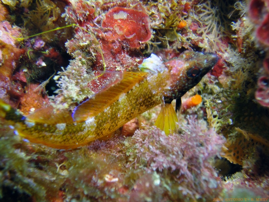 Se trata de un pequeño pez que se puede observar en zonas rocosas a escasa profundidad, destaca su color amarillo y la cabeza negra este color lo tienen los machos en época de reproducción y la hembra es mas pequeña y de color pardo.