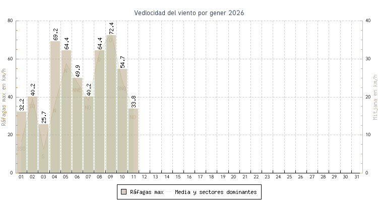| min | max | mitjana | Velocitat (rafages) | Sector | ||