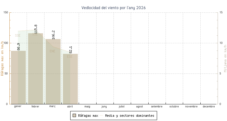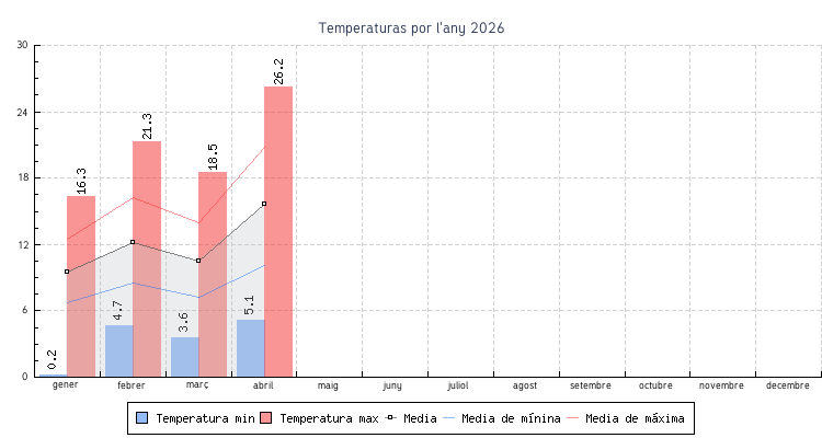 | abril | 5.1 °C | 10.1 °C | 26.2 °C | 20.8 °C | 15.6 °C | 8.5 km/h | 82.1 km/h | ESE |