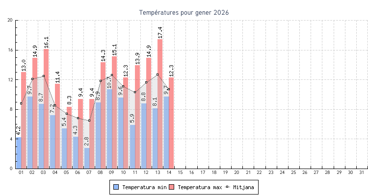 | 14 | 9.7 °C | 12.3 °C | 10.7 °C | 0.0 km/h (0.0 km/h) | N |