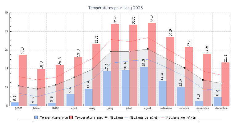 | Mes | Temperatures min | Temperatures max | Mitjana mensual |