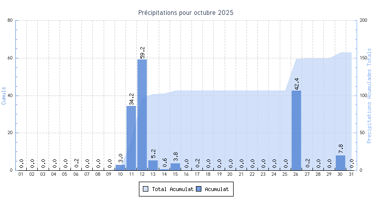 | Total | 12.0 °C | 27.1 °C | 19.2 °C | 4.5 km/h (48.3 km/h) | 156.8 mm | |