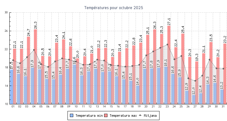 | 01 | 17.5 °C | 22.1 °C | 19.6 °C | 6.1 km/h (27.4 km/h) |  NO | 0.0 mm |