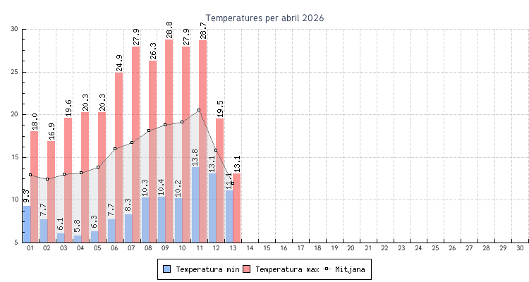 | 11 | 13.8 °C | 28.7 °C | 20.5 °C | 5.6 km/h (24.1 km/h) | N |