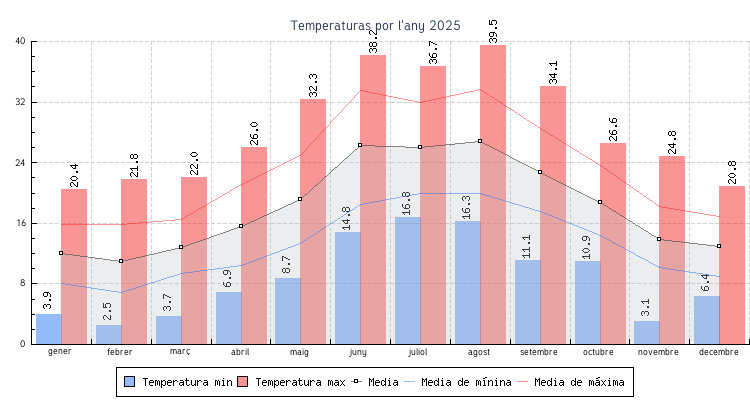 | Mes | Temperatures min | Temperatures max | Mitjana mensual |