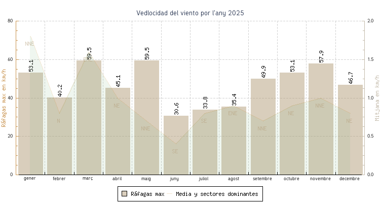| gener | 3.9 °C | 8.1 °C | 20.4 °C | 15.9 °C | 12.0 °C | 1.8 km/h | 53.1 km/h | NNE |