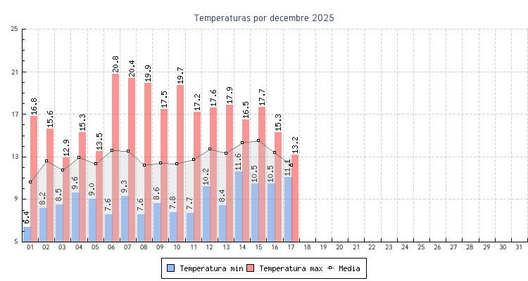 | 17 | 11.9 °C | 13.2 °C | 12.6 °C | 0.0 km/h (8.0 km/h) | N |