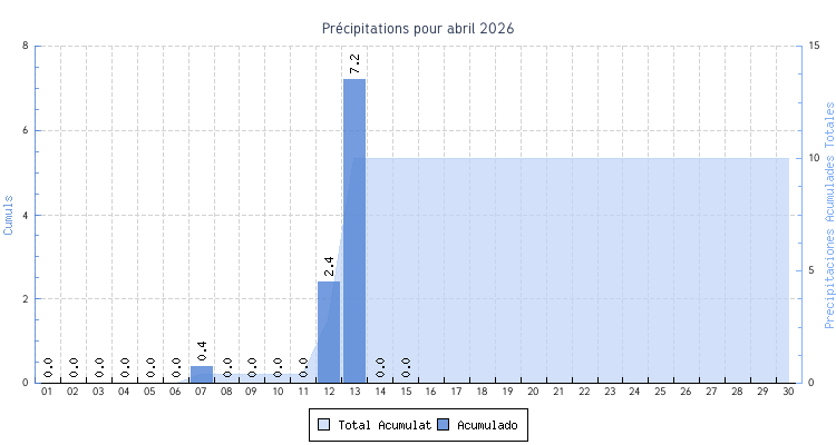 | Total | 9.4 °C | 25.5 °C | 15.3 °C | 7 km/h (43.4 km/h) | 10 mm | |