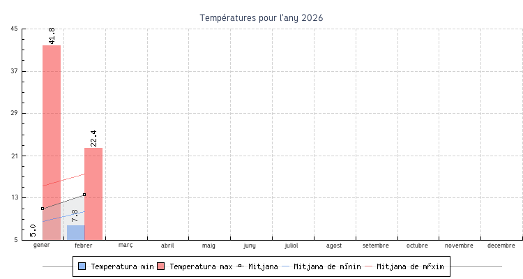| gener | 5.0 °C | 8.6 °C | 41.8 °C | 15.3 °C | 11.0 °C | 8.7 km/h | 64.4 km/h | O |
