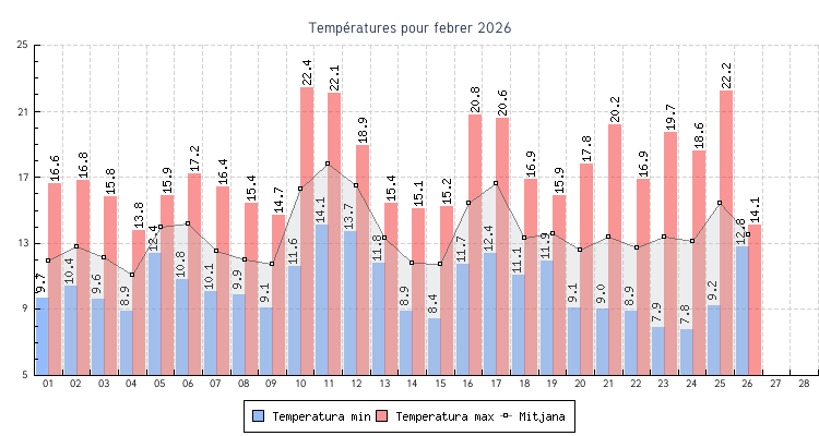 | 26 | 12.8 °C | 14.1 °C | 13.5 °C | 7.1 km/h (17.7 km/h) | NNE |