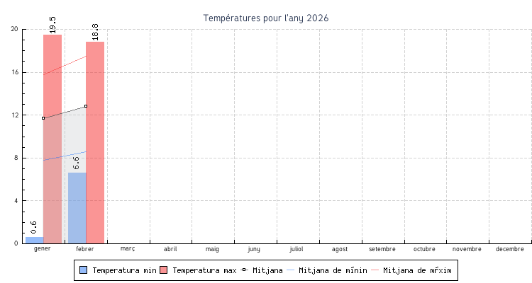 | Mes | Temperatures min | Temperatures max | Mitjana mensual |