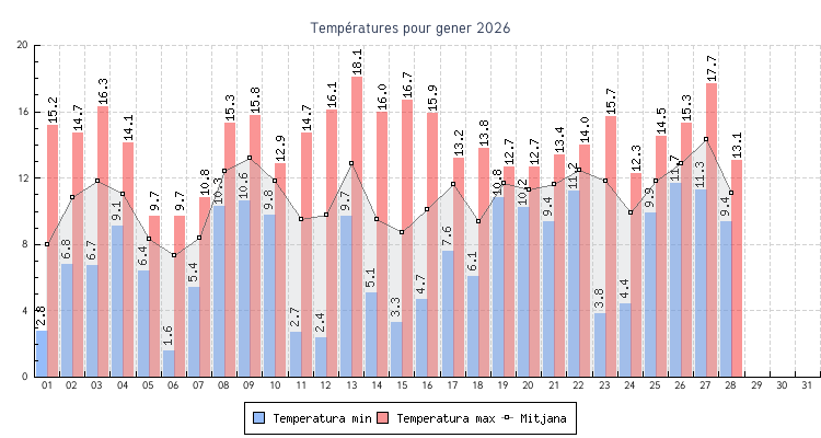 | 01 | 2.8 °C | 15.2 °C | 8.0 °C | 0.5 km/h (14.5 km/h) | S |
