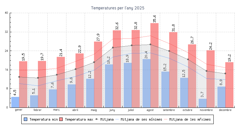 | Mes | Temperatures min | Temperatures max | Mitjana mensual |