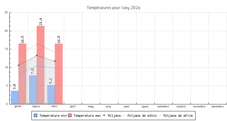 | Mes | Temperatures min | Temperatures max | Mitjana mensual |