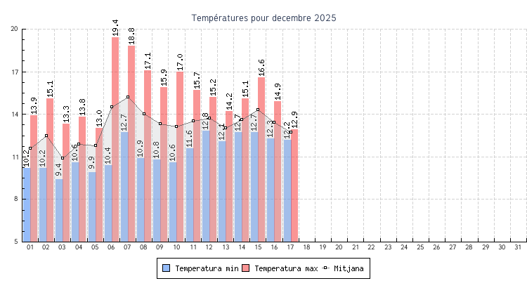 | 17 | 12.2 °C | 12.9 °C | 12.7 °C | 2.6 km/h (14.5 km/h) | NNE |