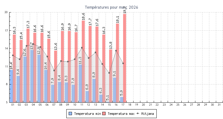 | 09 | 8.3 °C | 16.9 °C | 11.8 °C | 2.5 km/h (25.7 km/h) | ONO |