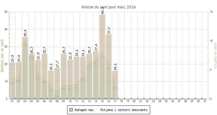 | min | max | mitjana | Velocitat (rafages) | Sector | ||