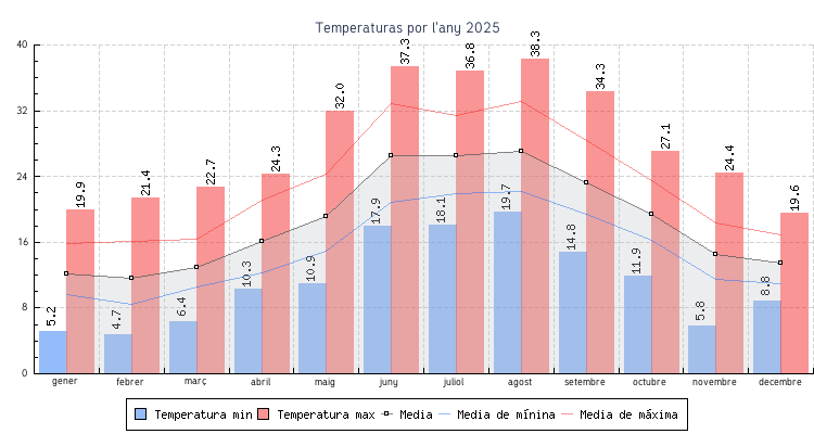 | Mes | Temperatures min | Temperatures max | Mitjana mensual |