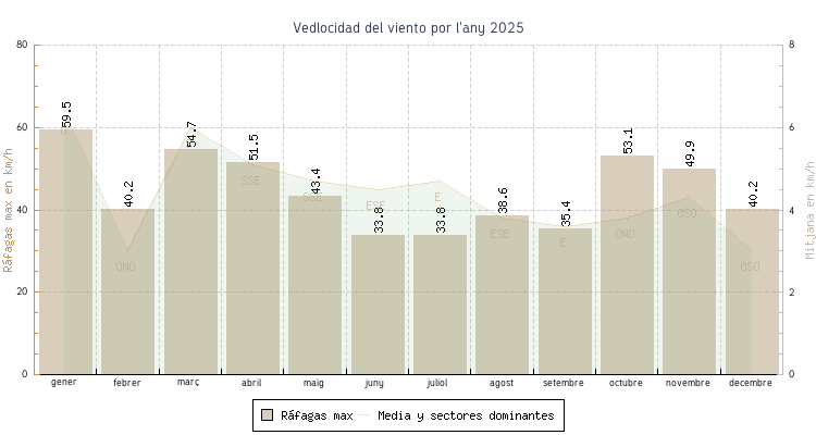 | maig | 10.9 °C | 14.9 °C | 32.0 °C | 24.3 °C | 19.2 °C | 4.7 km/h | 43.4 km/h | SSE |