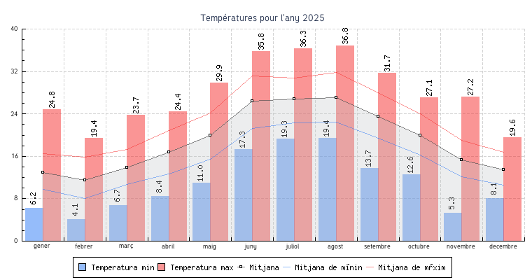 | Mes | Temperatures min | Temperatures max | Mitjana mensual |