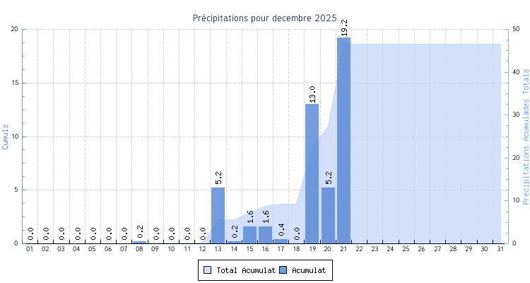 | Total | 8.1 °C | 19.6 °C | 13.5 °C | 2.5 km/h (56.3 km/h) | 46.6 mm | |