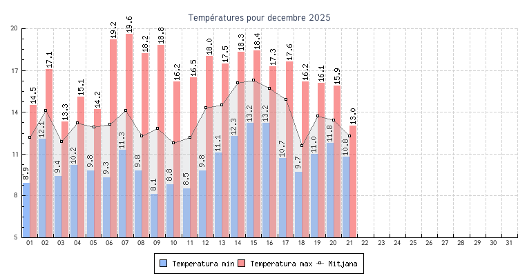 | 19 | 11.0 °C | 16.1 °C | 13.7 °C | 0.0 km/h (4.8 km/h) | E |