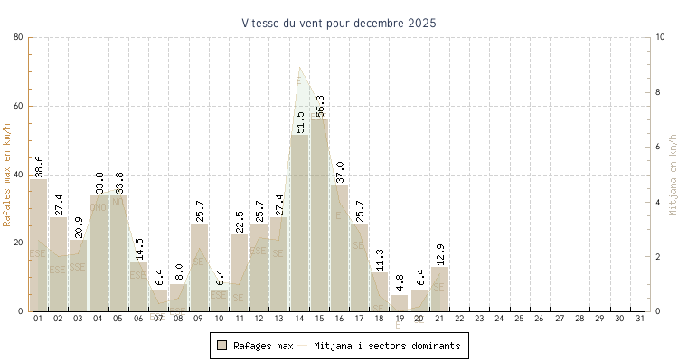 | min | max | mitjana | Velocitat (rafages) | Sector | ||