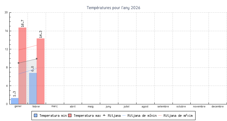 | Mes | Temperatures min | Temperatures max | Mitjana mensual |