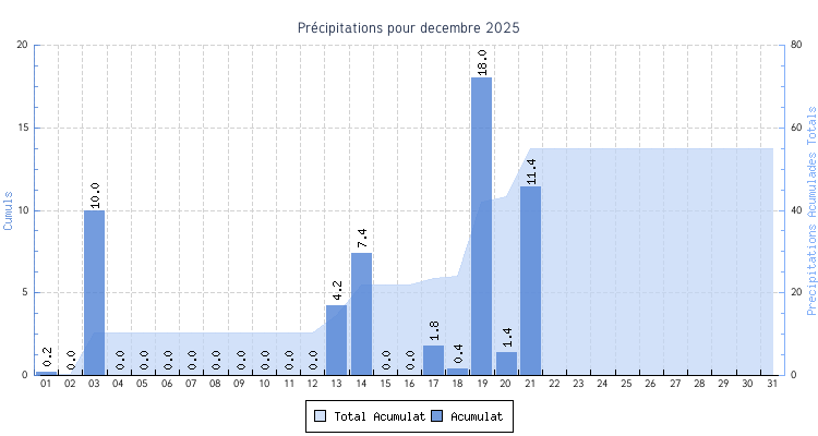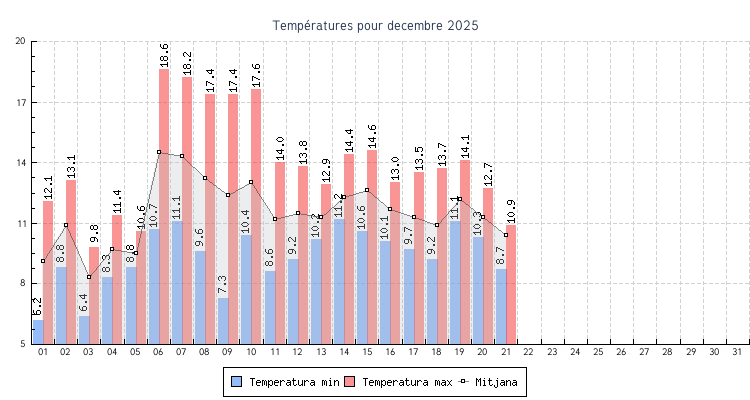 | Total | 6.2 °C | 18.6 °C | 11.5 °C | 3.4 km/h (43.4 km/h) | 54.8 mm | |