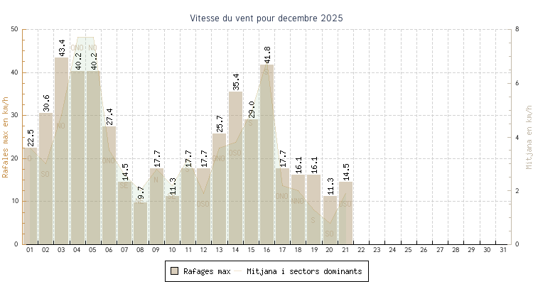 | min | max | mitjana | Velocitat (rafages) | Sector | ||