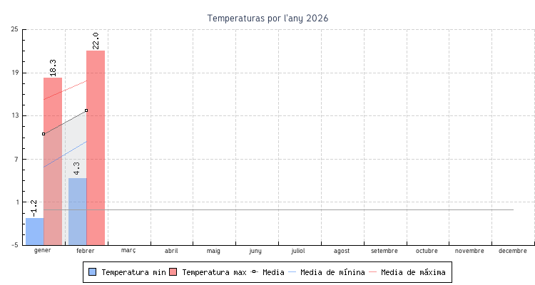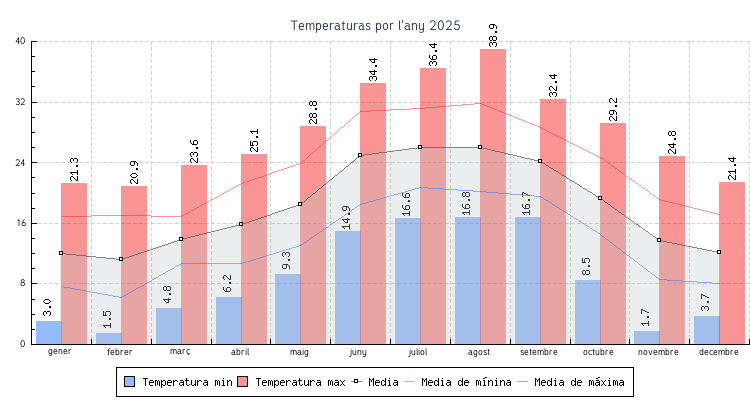 | Mes | Temperatures min | Temperatures max | Mitjana mensual |