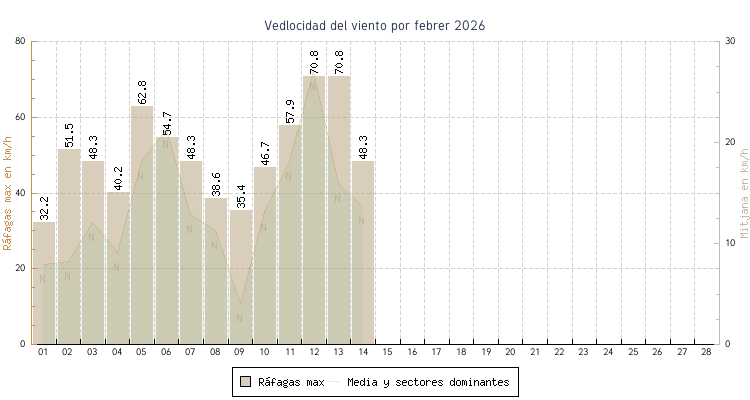 | min | max | mitjana | Velocitat (rafages) | Sector | ||