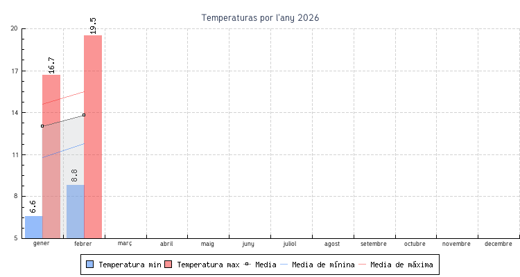 | Mes | Temperatures min | Temperatures max | Mitjana mensual |