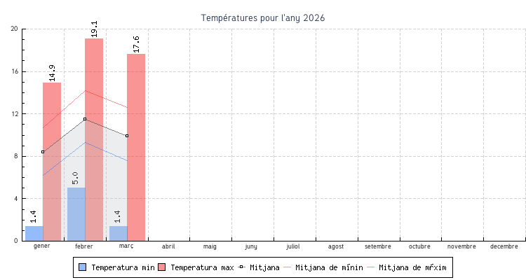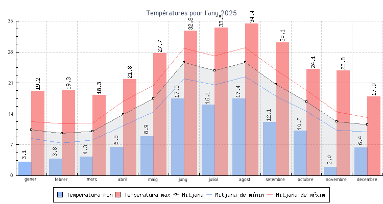 | Mes | Temperatures min | Temperatures max | Mitjana mensual |