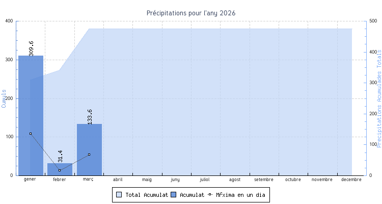 | febrer | 5.0 °C | 9.3 °C | 19.1 °C | 14.2 °C | 11.5 °C | 10.5 km/h | 80.5 km/h | O |