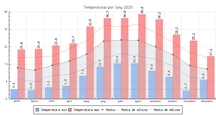 | Mes | Temperatures min | Temperatures max | Mitjana mensual |
