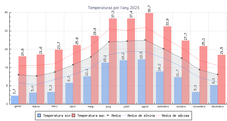 | Mes | Temperatures min | Temperatures max | Mitjana mensual |