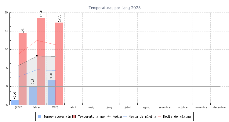 | gener | -3.6 °C | 2.7 °C | 14.4 °C | 8.9 °C | 5.7 °C | 4.4 km/h | 61.1 km/h | SSO |